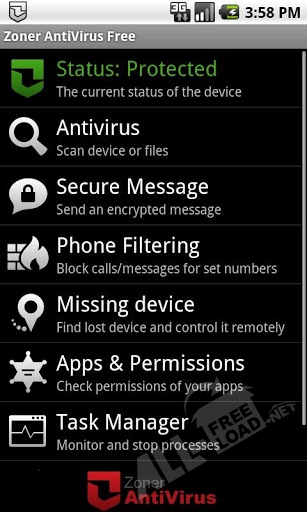 Приложение Zoner Antivirus Free можно скачать бесплатно, и получить антивирус, который локализован и используется во многих странах мира, и может отправлять зашифрованные сообщения используя СМС, электронную почту, а также в социальные сети Facebook, Twitter и другие. Надежная система шифрования защищает отправленные сообщения от чтения, если они будут перехвачены. Расшифровать их можно будет только с помощью специального ключа, который нужно будет сообщить получателю. Виджет для рабочего стола позволит следить за состоянием мобильного устройства и за проводимыми операциями в реальном времени.