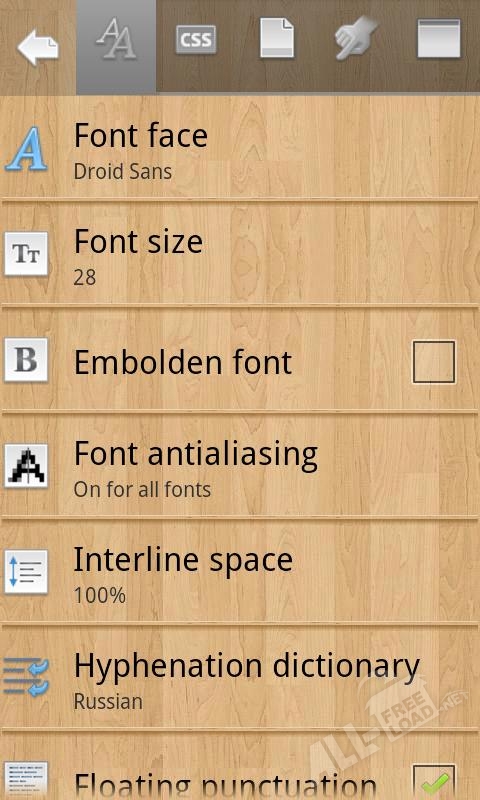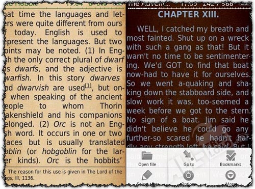 В мобильных устройствах на платформе ОС Андроид листание книжных страниц сопровождается реалистичной анимацией. Список последних файлов предусматривает демонстрацию титульных страниц для наглядности и удобства пользователя. Настройки можно индивидуализировать исходя из собственных предпочтений (установить дневной или ночной режим чтения, изменить яркость подсветки, выбрать фоновую текстуру и т.д.). Стоит отметить, что для того, чтобы убавить или увеличить яркость экрана, вам потребуется провести пальцем вдоль края сенсорного экрана. При помощи удобного инструментария, пользователь может: выделять фрагменты текста, копировать понравившиеся цитаты в буфер обмена и искать значения непонятных слов в словарях (Fora Dictionary, ColorDict, Aard Dictionary, GoldenDict). При невозможности осуществления процесса самостоятельного чтения воспользуйтесь голосовой функцией.