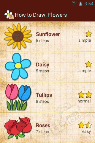 Каждый рисунок в приложении Как Рисовать: Цветы для Android разделен на 5-10 шагов, что значительно упрощает его понимание и помогает запомнить правильную последовательность действий. Все что требуется от пользователя, так это повторять все действия в инструкции и постепенно из-под его руки будут выходить настоящие шедевры. Если скачать бесплатно это приложение, то не нужно беспокоиться о выделении времени для уроков рисования, так как наставник всегда будет рядом в планшете или смартфоне пользователя и начать свои занятия можно в любое свободное время.