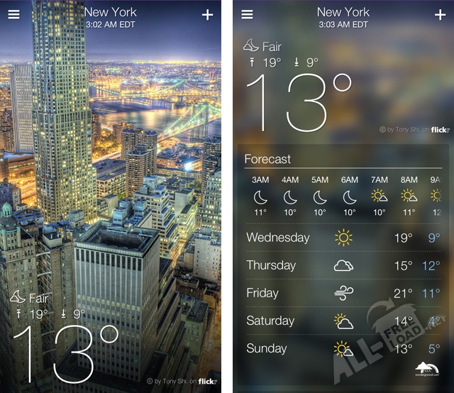 Yahoo Погода прекрасно сочетает в себе великолепный дизайн, который сможет украсить экран любого устройства, и множество разнообразных функций. Это приложение предоставит пользователю информацию о температуре и влажности воздуха, скорости ветра и других метеорологических данных в заданном городе. К тому же, его можно скачать бесплатно. Чтобы воспользоваться его возможностями, необходимо подключение к интернету, а при желании узнавать погоду в местах своего нахождения, нужно настроить GPS функцию. После активации необходимых функций и установки приложения, на рабочем столе устройства можно поместить виджет и получать только самую важную информацию о погоде.