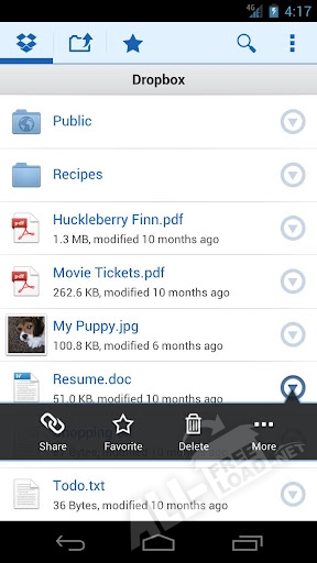 Бесплатная служба Dropbox для Андроид размещает каждый добавленный в неё файл на ваши ПК, устройства Android, а также на сайт Dropbox, что в любом месте обеспечивает доступность необходимых файлов. Переименовывать файлы для сохранения истории изменений больше не потребуется с программой Dropbox, которую можно скачать бесплатно. Программа позволяет с удобством просматривать фото и видео в дороге, предоставляя к ним доступ друзьям и коллегам. В случае утери или поломки вашего гаджета на базе Android, размещённые при помощи данного приложения файлы останутся доступными и невредимыми. Имеется возможность непосредственного сохранения вложений в программе. Лёгкость редактирования файлов в программе является её значительным преимуществом.