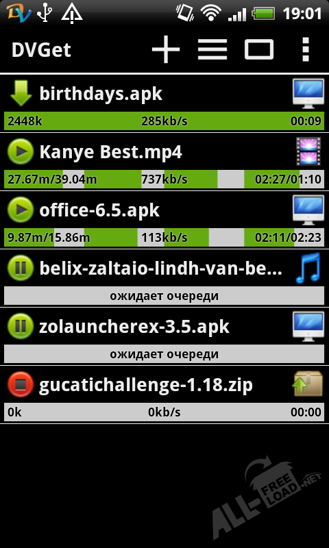 Приложение DVGet для Android является мощным менеджером загрузки, который способен осуществлять закачку сразу нескольких файлов одновременно. Данная программа имеет автоматическую проверку файлов на наличие вирусов, троянов и других вредоносных объектов, что позволяет пользователю не беспокоиться о безопасности своего смартфона или планшета. Разобраться с навигацией не составит труда, так как интерфейс приложения выполнен очень удобно, любые действия осуществляются на интуитивном уровне. В верхней части экрана расположена панель, где находится информация обо всех загрузках. Пользователь DVGet может управлять процессом закачки, как в строке состояния, так и в контекстном меню, которое вызывается длительным нажатием на выбранном файле.