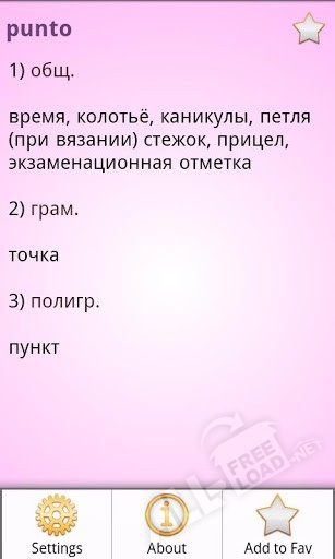 Русско-испанский словарь скачать бесплатно означает получить доступ к следующим функциям: контекстному поиску, который позволяет перевести на иностранный язык любое слово, содержащее в статье. Автоматическому сохранению вводимых в поисковое поле данных. Возможности работать со списками «история» и «избранное», включая редактирование содержащихся в них данных, а также полное или частичное удаление из памяти. Быстрый доступ к панели настроек, находящейся в нижней части экрана. При помощи последних пользователь сможет индивидуализировать программу, сделав работу с ней более комфортной (доступны изменение шрифта и цветовой темы). Установка мини-программы «Случайное слово дня» позволяет углубиться в изучение испанского языка, ежедневно получая «дозированную» информацию, которая лучше усваивается.