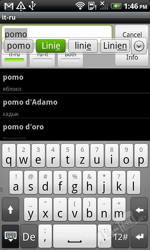 Русско-итальянский словарь скачать бесплатно можно здесь: вы получите отличного помощника для учебы, работы (в качестве справочного пособия) и путешествий (как разговорник). Он умеет «угадывать» слова по уже введенным в поисковое поле буквам, выводя список запрограммированных предположений. Иными словами, программа обеспечивает пользователям оперативный поиск искомых выражений, интерпретирует их в обоих направлениях и мгновенно выдает качественный детальный перевод.