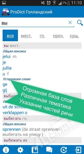 Контекстный поиск помогает найти перевод любого непонятного слова в статье – нажмите на область, в которой оно расположено и удерживайте до появления результата. Перед тем, как Русско-голландский словарь скачать бесплатно с нашего сайта, ознакомьтесь со списком разрешений, к которым программа попросит доступ: просмотр, изменение и / или удаление данных, находящихся на SD-карте, проверка лицензии Google Play, доступ к интернет – ресурсам (для оперативного обновления приложения), запрет на переход мобильного устройства в режим сна и просмотр данных о сетевых подключениях.