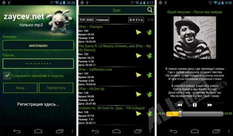 Простая программа Zaycev.net является приложением для работы с контентом сайта zaycev.net напрямую, без использования браузера. Проигрыватель позволяет скачать бесплатно любимые песни с одноименного сайта. Zaycev.net для андроид имеет небольшие размеры и занимает немного места на внутренней памяти планшета или смартфона, и обладает небольшим потреблением интернет-траффика в онлайн режиме. Используя гибкую систему поиска, программа предложит вам несколько вариантов песен в формате MP3 по введенному запросу или ключевым словам, после чего вы сможете прослушать выбранную песню и скачать понравившуюся в память вашего Android смартфона. Скачанные музыкальные композиции можно прослушивать прямо со смартфона, для этого больше не потребуется подключение к сети интернет. Также вы сможете добавлять любимые композиции в избранное для облегчения поиска любимых песен. Приложение позволяет вам просматривать и сохранять тексты понравившихся песен, а музыкальный проигрыватель имеет функцию их отображения, и вы можете просматривать их прямо на экране воспроизведения.