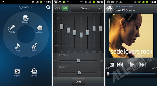 Многофункциональный медиа проигрыватель RealPlayer для андроид, предназначен для прослушивания музыки, просмотра изображений и фотографий, а также видеозаписей. RealPlayer – это многофункциональный плеер для мобильных устройств на операционной системе Android, позволяющий воспроизводить музыку и видео. Этот медиа проигрыватель поддерживает огромное количество аудио- и видео- форматов, количество которых ограничено только форматами поддерживаемыми самим смартфоном. Медиа-проигрыватель имеет интуитивно понятный пользовательский интерфейс, который позволяет перейти к работе с медиа непосредственно после запуска приложения. При работе с музыкой приложение предоставляет широкий выбор способов сортировок. Отсортировать музыку можно по песням, по исполнителям, по альбомам, отсортировать по известным жанрам или же создать собственные плей-листы. Кнопка поиска поможет найти нужную песню по названию или исполнителям. При воспроизведении плеер отображает обложку альбома, и имеет широкий спектр способов управления списком воспроизведения, порядком воспроизведения, громкостью. Встроенный эквалайзер с легкостью подстраивает звучание композиций под слух пользователя. Несколько доступных виджетов позволяют управлять приложением с экрана блокировки смартфона или планшета.
