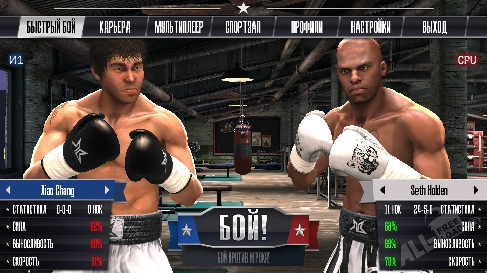 После тренировок вы можете принимать участие в настоящих поединках. Чтобы участвовать в боях, необходимо выбрать режим игры: карьерный (можно строить карьеру профессионального боксера, сражаясь с разными компьютерными противниками и продвигаться к заветной цели) или многопользовательский. В многопользовательском режиме можно играть с реальными противниками, которые тоже решили скачать Реал Боксинг на андроид. Боксер может наносить удары по противнику двумя руками, выполнять хуки, джебы, апперкоты, при этом не забывайте ставить блоки и защищаться от ударов соперника, ведь за каждые нанесенные удары вы получаете очки, от которых зависит победа вашего подопечного. За пропущенные удары боец теряет частичку своего здоровья, а на теле появляются синяки и следы ударов.