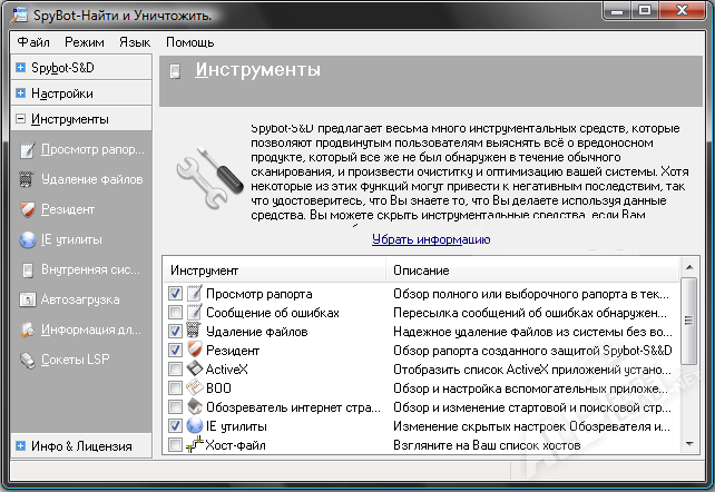 Программа Spybot Search Destroy занимается поиском и уничтожением так называемых рекламных жучков и шпионов. Алгоритм работы программы прост: находя подозрительные элементы и сравнивая их с имеющейся базой нежелательных модулей, программа незамедлительно удаляет их. Если же удаление невозможно, то функционал программы заменяет рекламные баннеры на пустые блоки.