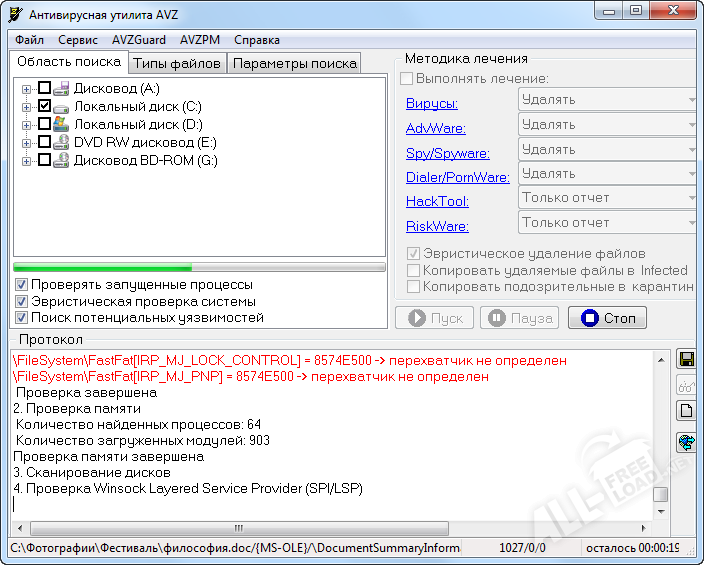 Работа в полезном режиме лечения вносит изменения в систему и реестр. Так, удаляются найденные вредоносные модули и вся сопутствующая информация (ярлыки, данные реестра). После работы с системой AVZ не оставляет следов вирусов и шпионских программ.
