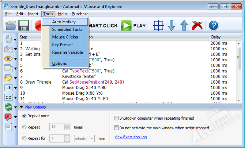 Программа полезна как для работы в офисе, так и для операций дома. Позволяет создавать часто повторяемые сценарии для игр или задач. Если Автоматик Маус Энд Кейборд скачать, то можно будет не только повторять действия, как это делают аналогичные программы, а и планировать их запуск, редактировать записанные сценарии, регулировать скорость их воспроизведения. Если сценариев много, вам доступна их настройка и определение, какие будут выполняться в первую очередь, во вторую и так далее. Программа дает возможность оптимизировать и автоматизировать множество задач.