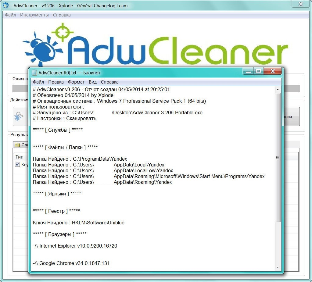 Поиск подлежащих удалению программ начнется после клика по кнопке «Сканировать»: AdwCleaner отобразит все папки и файлы в системном реестре приложений, которые являются рекламными продуктами. После завершения проверки необходимо снять галочки напротив тех приложений, которые вы не желаете удалять, затем нажать кнопку Очистить. Программа уничтожит записи реестра и файлы, относящиеся к рекламному ПО, и осуществит перезагрузку. После этого откроется для просмотра отчёт со списком удаленных элементов.