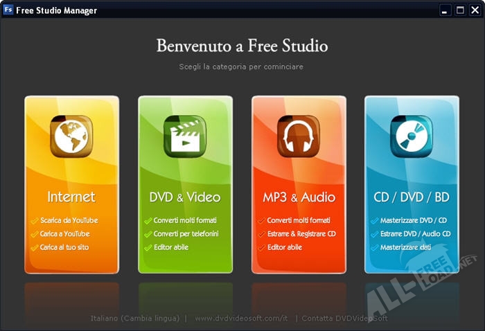 Free Studio – общий пакет различных мультимедийных приложений компании DVDVideoSoft, в который вошли более чем сорок утилит, разделенных для удобства на восемь разделов по своему функциональному назначению. Каждая из программ по отдельности, как и весь пакет в целом, не требуют оплаты и не ограничены сроком использования, поэтому free studio скачать бесплатно и использовать может любой пользователь.