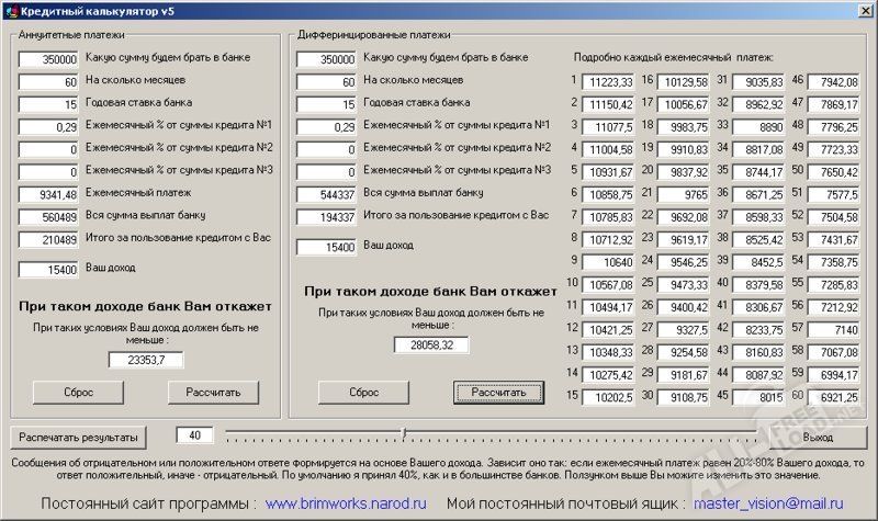 Набор встроенных функций позволяет принимать во внимание множество факторов, которые могут повлиять на точность расчетов. Например, можно учитывать количество календарных дней в году, вероятность досрочного погашения кредита и многое другое. Программа распространяется абсолютно бесплатно, что является существенным достоинством данного продукта. Так же, кредитный калькулятору на компьютер можно преобразовать в таблицу Excel.