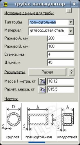 Для того чтобы правильно просчитать массу металлопроката, необходимо выбрать одну из конфигураций: прямоугольную, квадратную или же круглую. После этого, Вам нужно выбрать из списка материалы металлопроката. На данный момент, программа, которую мы представляем, позволяет просчитать более 60 вариантов, среди которых две группы: пластиковые и металлические разновидности. Следующий этап: надо вписать размер трубы, а именно: диаметр, длину стороны и толщину всех стенок. Всю остальную работу будет делать наш калькулятор, поэтому обязательно воспользуйтесь нашим приложением.