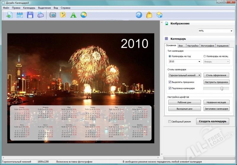 Программа предоставляет пользователю возможность создания календарной сетки на любой год, а также месяц, при этом расчет рабочий и выходных дней производится автоматически. Имеются несколько готовых подборок праздничных дней – государственные, религиозные, а также перенесенные выходные. Добавление фото и изображений производится посредством масок и рамок, при этом изображения могут располагаться как на заднем, так и на переднем плане общей композиции. Также имеется возможность создания коллажей из нескольких фотографий.
