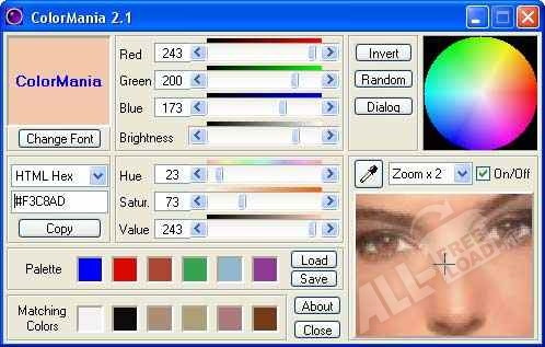 Справа вверху находится специальный круг, который также помогает подобрать нужный цвет. Здесь есть кнопка «Invert», которая инвертирует выбранный цвет, а также клавиша «Random», создающая случайный. Зайти в интерактивную панель выбора цвета можно с помощью кнопки «Dialog». Под кругом расположилась пипетка с экранной лупой. Она может определить цвет любого объекта на экране, стоит лишь перетащить её на него. Область будет увеличена, так что вы сможете точно определить нужный оттенок. Именно этот инструмент побуждает многих дизайнеров колорманию скачать и активно использовать, к счастью, программа есть на нашем портале.