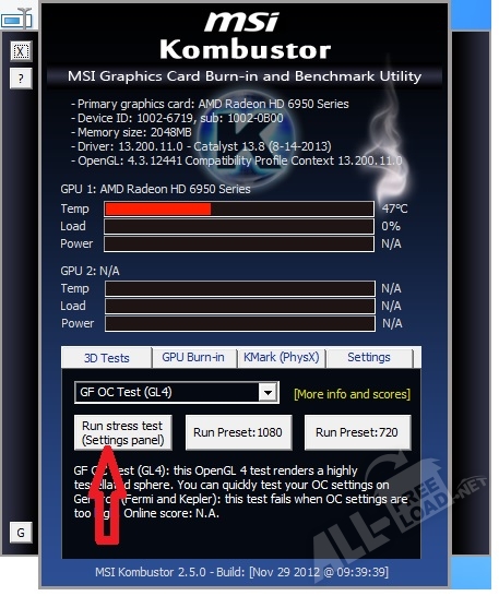 Также доступно проведение 3d диагностики, позволяющей выполнить GPU burn-in test для трехмерной графики API, включающей Open GL 2 и Open GL 3, а также функции Direct 3D, обновленные до 9-11 версии. Если MSI Kombustor скачать на русском, Вы получите утилиту, позволяющей узнать параметры бенчмаркинга в реальном времени и убедиться в стабильности графической карты.