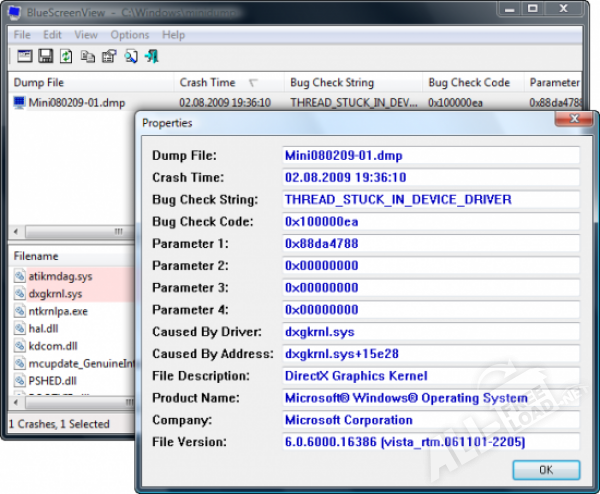 - окно программы содержит две панели. В верхней панели отображается дата, код ошибки и драйвер, который, предположительно, вызвал BSOD, в нижней - приводится список всех драйверов, которые были загружены на момент появления ошибки;