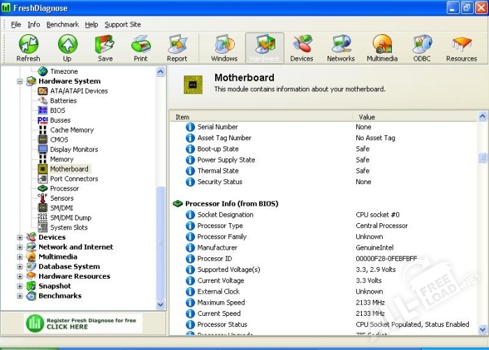 Fresh Diagnose – специализированная утилита проверки работоспособности всех узлов компьютера, состояния операционной системы и сравнения их с эталоном. Программа тестирует процессор, материнскую плату, память, жесткие диски, видеокарту и другие критически важные узлы вычислительной системы. Программу Fresh Diagnose скачать бесплатно может каждый пользователь Интернета.