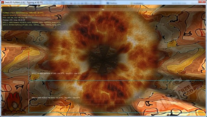 FurMark – небольшая утилита, которая создана специально для выполнения стресс-теста OpenGL API-совместимых графических карт. Данное приложение может вывести полученные сравнительные характеристики видеокарты пользователя с видеоадаптерами других пользователей, либо с новой картой самого пользователя. В утилите FurMark специальный алгоритм тестирования используется таким образом, что во время стресс-теста происходит перегрев видеокарты. Поэтому утилита должна применяться на полностью исправной и настроенной системе, в которую установлены самые последние версии драйверов.