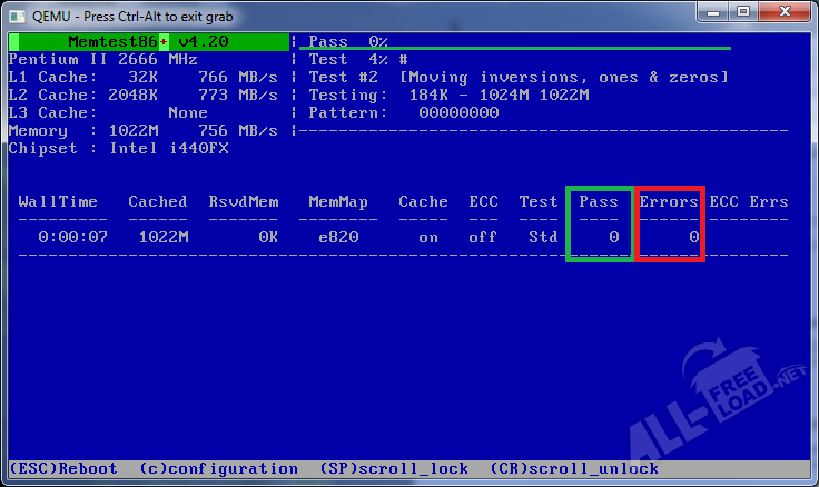 К тому же можно провести и облегчённый тест ОЗУ, для которого будет достаточно получаса работы данного приложения. Даже если за столь короткое время никаких ошибок обнаружено не будет, то можно смело считать оперативную память полностью исправной, об этом пользователя известит надпись в заголовке окна – 0 errors. Если же потребуется провести более глубокую проверку оперативной памяти, то тогда целесообразно провести работу MemTest на протяжении суток. Если и тогда ошибок обнаружено не будет, то такую память и такую систему можно считать полностью работоспособными.