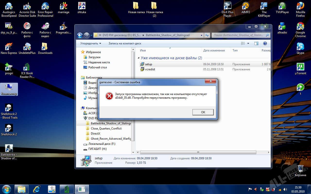 Условно все ошибки с dll-файлом d3dx9_35 мы можем разделить на две основные группы. В первую группу ошибок входят такие, которые связаны либо с отсутствием, либо с повреждением этого файла. (Файлы-библиотеки чаще всего страдают от вирусных атак, внепланового / экстренного отключения системы либо от серьезного сбоя в задействовавшем их приложении.) Об ошибках этой группы говорят сообщения: «файл D3dx9_35.dll отсутствует или поврежден», «файл недоступен», «ошибка доступа к файлу». Как исправить подобную ошибку? Для исправления данной ошибки Вам понадобиться скачать D3dx9_35.dll, что можно сделать на нашем сайте. Здесь Вы можете бесплатно и без вирусов скачать D3dx9_35.dll для Windows 7/8/10. Далее Вы должны разместить файл в нужной директории, которая указана в информации под этой статьей...