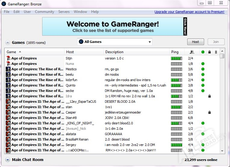 Существует три версии GameRanger – бесплатная, «серебряная» и «золотая». Участники, пользующиеся приложением бесплатно, имеют возможность играть в комнатах со свободным доступом и завести не больше 50 друзей. Участники из второй группы (серебряные) обязаны платить в год 19.95 долларов абонплаты, и могут иметь до 100 друзей и другие преимущества. Участники «золотой» группы платят абонплату в размере 39.95 долларов в год, и могут завести до 500 друзей. Но самое главное – они не видят рекламные баннеры.