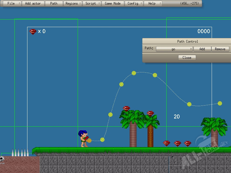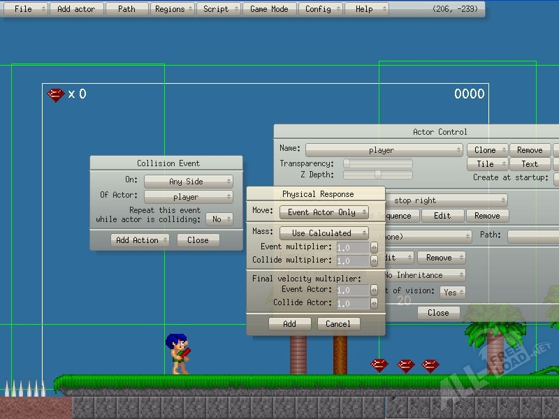 Game Editor позволяет осуществить все фантазии создателя новой игры: можно запрограммировать действие не только основных персонажей, но и второстепенных объектов. Это делает игру динамичнее и интереснее. Управлять игровыми объектами (акторами) очень просто: нужно только указать возможные действия посредством т.н. системы дорожек. Также имеется возможность определять действие персонажей в зависимости от игровых событий. Редактирование уровней производится при помощи визуального режима.