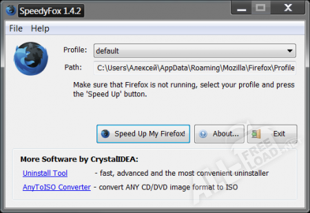Встроенные компоненты программы СпидФокс дают возможность многократно увеличить быстродействие интернет-обозревателя Mozilla Firefox. Утилита автоматически производит оптимизацию SQLite-библиотеки, где размещаются журналы отчетов, закладки, информация о пользовательских настройках и другие файлы, непосредственно влияющие на работу веб-браузера. Программа SpeedyFox не требует полной инсталляции на компьютер, так как представляет собой компактную портативную версию, а значит и не нуждается в большом количестве системных ресурсов. Чтобы главное меню приложения отображалось на русском языке, достаточно установить специальный русификатор.