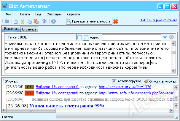 Программный продукт Етхт Антиплагиат представляет собой набор мощных инструментов для качественной проверки текстового контента на предмет определения уникальности. Используемые алгоритмы вычислений позволяют получить наиболее достоверные результаты уникальности, в отличие от многих аналогичных программных продуктов. Части текста, которые не соответствуют выставленным в настройках приложения параметрам, выделяются определенным цветом. Кроме этого, в нижней части окна отображается информация об интернет-ресурсах, где и были обнаружены совпадения. Программа Etxt Антиплагиат позволяет осуществлять качественную проверку как отдельных текстов, так и целых веб-сайтов.