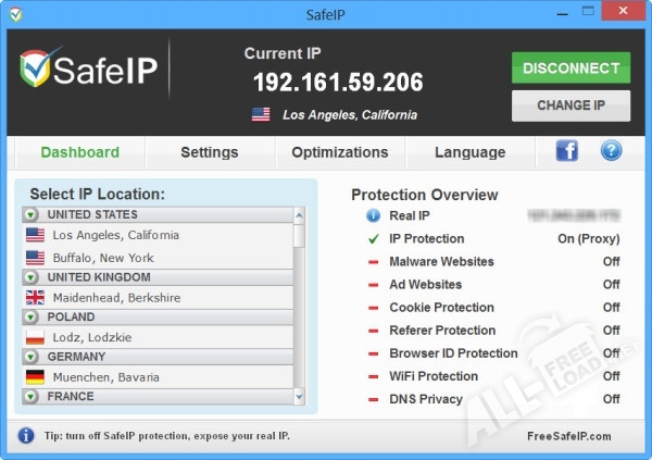SafeIP – это очень полезное приложение, которое предназначено для осуществления анонимного путешествия по просторам Интернета, с посещением самых различных сайтов. Подобный «эффект невидимки» достигается благодаря тому, что происходит скрытие реального IP-адреса пользователя, что это уже делает невозможным, для сервисов и сайтов в Интернете, вычислить активность их посетителя, обладающего такой программой. При такой способности SafeIP остаётся востребованным приложением. А также благодаря тому, что оно имеет невероятно простое управление и тому, что рассчитано на применение рядовым пользователем, не имеющим представления, как работать с этой программой.