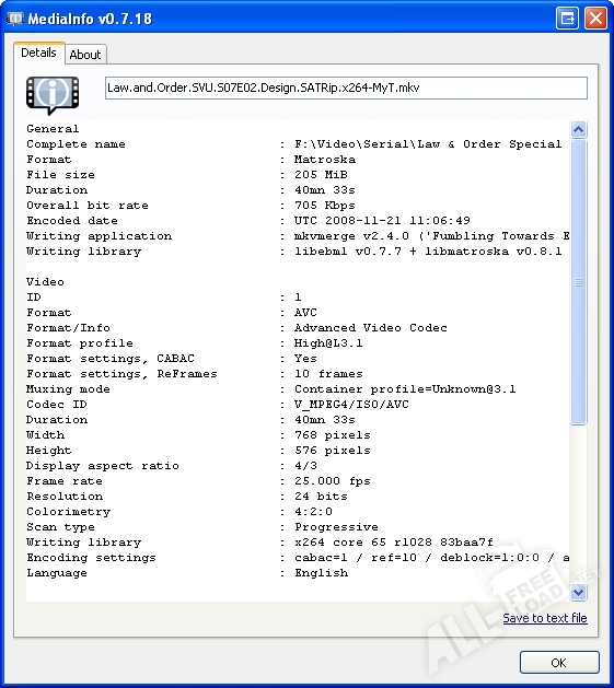 Программный продукт MediaInfo способен предоставить пользователю всю необходимую и полную информацию о имеющихся на персональном компьютере медиа-файлах. В специальное диалоговое окно приложение выводит данные о битрейте файла, количестве кадров, используемом для сжатия кодеке и многие другие полезные сведения. Стоит отметить, что программа МедиаИнфо распространяется как лицензионный продукт с открытым исходным кодом. Среди поддерживаемых форматов медиа-файлов имеются OGG, DivX, MPEG-1 и, конечно же, MP3 цифровой формат. Приложение также способно эффективно работать с различными субтитрами, в числе которых стоит отметить SAMI и SRT.