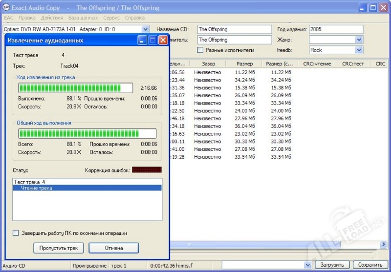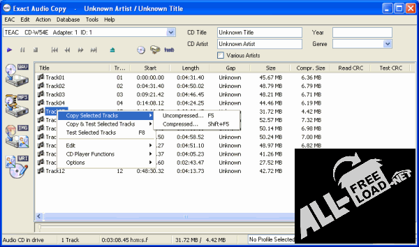 Приложение Exact Audio Copy предназначено для копирования музыкальных файлов непосредственно с аудио-дисков на винчестер персонального компьютера. Помимо этого, программа предоставляет возможность конвертации извлеченных медиа-файлов в различные цифровые форматы, например, WAV или MP3. Стоит отметить, что в приложении реализована поддержка ATAPI приводов. Кроме множества встроенных функций, программа Экзакт Аудио Копи оснащена собственным мультимедийным проигрывателем для воспроизведения аудио-файлов и обладает необходимыми инструментами для редактирования ID3 тегов. Цифровые технологии, которые внедрены в программу, позволяют копировать информацию даже с сильно поврежденных дисков.