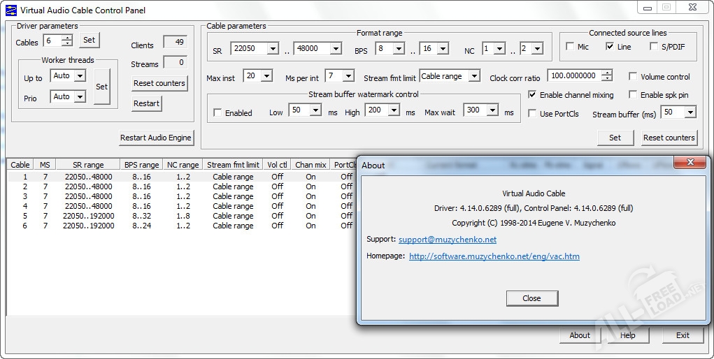 Virtual Audio Cable является доступным на русском языке программным обеспечением, создающим виртуальные аудио-кабели для приема и передачи звука, с помощью которых звук связывается воедино. Пользователь задает устройства входа аудиосигнала (например, медиаплеер), подключая к программе микрофон (вторая дорожка), после чего выводит звук на динамики или наушники. В процессе смешивания потоков не утрачивается исходное качество звучания. Отличительная черта Virtual Audio Cable для Windows – программа использует несколько потоков, исходящих от разных приложений, одновременно. Вам будет полезно Виртуал Аудио Кейбл скачать, если необходимо решить такие задачи: хотите создать музыкальный «микс», объединяя сигналы разных программ (эквалайзер, генератор звука, редактор эффектов и т.п.). Или вам необходимо, чтобы музыка с компьютера выводилась без помех на коммуникатор (Skype), чтобы ваш собеседник ее тоже слышал, но без искажений. Посредством Virtual Audio Cable выстраивается неразрывная цепочка, когда одно приложения получает звук от другого, притом не требуется дополнительных устройств.