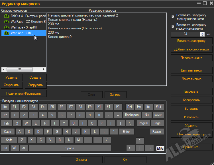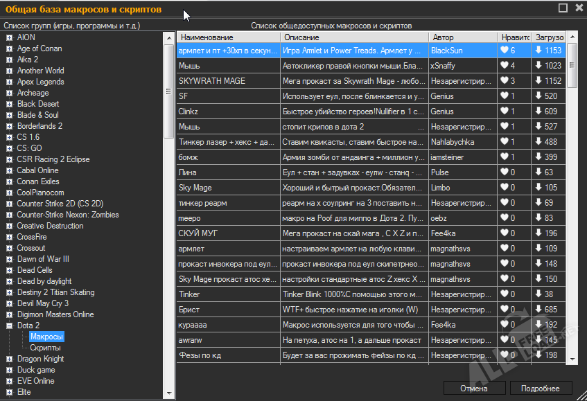Общая база содержит боле 1000 готовых макросов и скриптов для популярных онлайн игр на любой вкус, начиная от простейшего повторного нажатия клавиши до сложнейшего скрипта по контролю отдачи в онлайн шутерах.