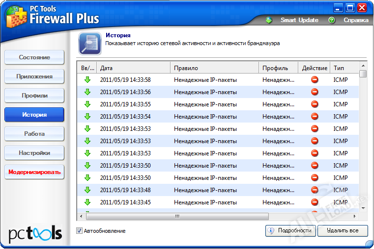 Заботясь о безопасности персональной информации, любой пользователь может PC Tools Firewall Plus скачать бесплатно, и после запуска он автоматически возьмет все сетевые процессы под свой контроль. При старте программы также подключается модуль, позволяющий сканировать операционную систему в реальном времени. Диалоговое окно всплывает только в том случае, когда программа хочет определиться, пускать исполняемый файл в Интернет или заблокировать ему доступ навсегда. Списки разрешенных и потенциально опасных приложений можно найти в настройках PC Tools. Сервер компании регулярно выпускает важные обновления и совершенствует свою базу вредоносных компонентов.