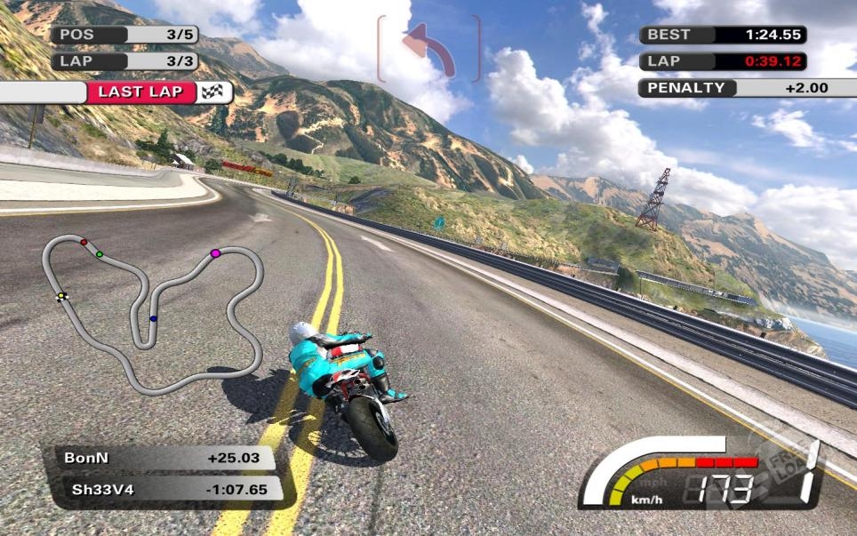 Трассы в увлекательной игре Мотогонки очень хорошо продуманы и весьма разнообразны. Городские пейзажи в окружении урбанистической архитектуры, сельские пасторальные виды, пересеченная местность, асфальтированные или грунтовые дороги и бездорожье - практически весь спектр фрагментов реального мира присутствует в этой прекрасной бесплатной игре.
