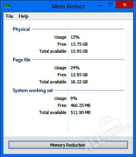 Mem Reduct – небольшое приложение с помощью которого можно быстро освободить неиспользуемые страницы памяти. Производится качественный анализ памяти, что даёт возможность убрать всё лишнее или неиспользуемое. Благодаря умному алгоритму, достаточно скачать Мем Редукт и забыть о том, что бывает нехватка ресурса памяти в системе. Приложение также отслеживает все изменения в данном отделе, позволяет отсортировать наиболее требовательные ресурсы. После закрытия используемой программы сразу освобождается дамп и кэш. Что обычно происходит только после перезагрузки системы или при нехватке ресурсов.