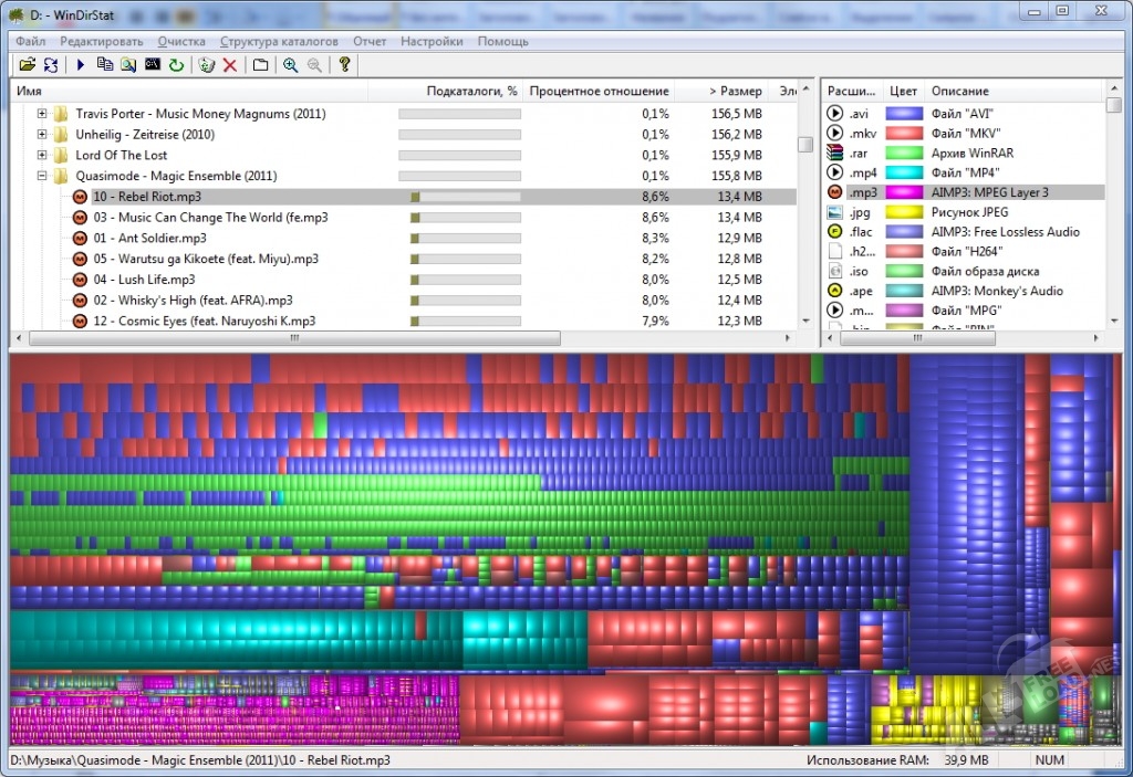 WinDirStat – это мощная утилита, обладающая открытым кодом, которая выполняет подробный анализ дискового пространства у любого привода, работающего в системе. Это приложение помогает пользователю наглядно увидеть подробную картину использования памяти. Для этого будет необходимо выбрать нужный диск или директорию, после чего WinDirStat предоставит визуальную информацию об имеющихся файлах. Для большего удобства каждый элемент, будет окрашен в свой собственный цвет, который будет зависеть от объёма занимаемого пространства на носителе. Такой подход даст возможность легко оценить то, что какие именно типы файлов занимают в памяти больше всего места. Например, по умолчанию, те файлы, которые занимают наибольшее место, окрашиваются в светло-синий цвет.