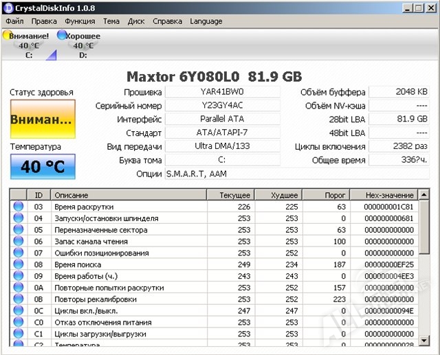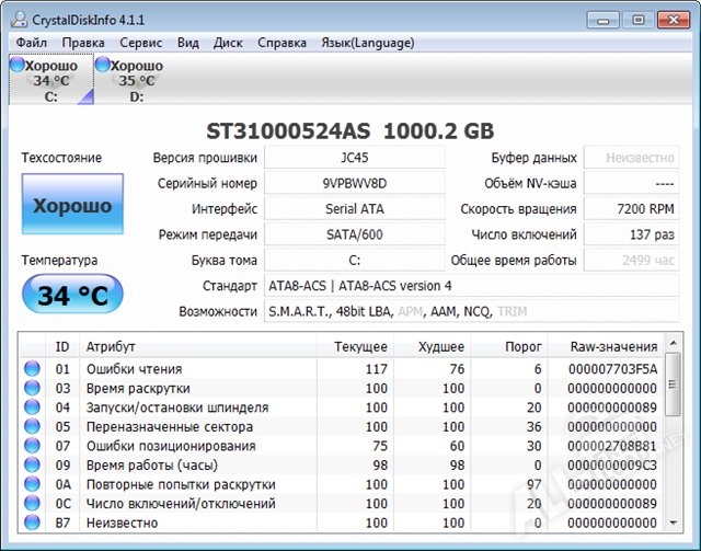При помощи утилиты пользователь может получить любые данные, касающиеся установленного на компьютере жесткого диска: серийный номер, разновидность прошивки, стандарт, время работы, интерфейс, и многое другое. Также пользователю доступны данные, которые собирает диагностическая система S.M.A.R.T. – ошибки чтения и секторов, производительность, данные о запуске и остановке шпинделя и о циклах включения и выключения, сведения об износе, и т.д.