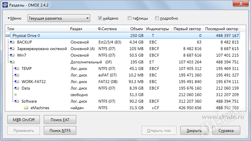 DMDE – программа для быстрой и качественной работы с параметрами дисков. Позволяет добавлять новые разделы, совмещать их между собой и удалять ненужные. Проработана система безопасности данных даже в случае сбоя системы. Скачать ДМДЕ можно по прямой ссылке на сайте. Установщик полностью совместим со всеми версиями ОС Виндовс и не требует дополнительного программного обеспечения. С помощью приложения пользователю доступны те разделы диска, которые система не видит. Это позволяет выполнить их диагностику, настройку и поиск неисправней (особенно, если присутствуют битые секторы).