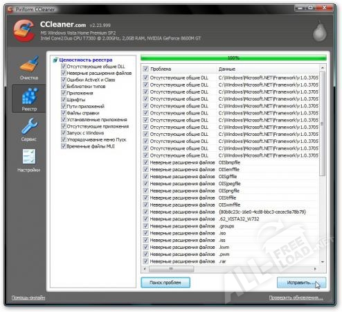 Для очистки реестра Windows в утилите CCleaner Portable имеется специальный модуль – Registry Cleaner, который подробно сканирует реестр, обнаруживая в нём различные нарушения в виде несоответствий и разных других проблем, к которым относятся неверные ключи реестра, расширения файлов, отсутствующие шрифты, DLL-библиотеки, элементы автозагрузки, и многие другие неисправности.