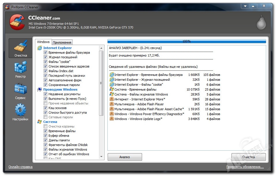 При очистке системы CCleaner portable производит «уборку» в местах, где хранятся: временные и log-файлы операционной системы, история поиска, ненужные дампы памяти образованные после аварийной перезагрузки Windows, а также фрагменты файлов Chkdsk. Естественно очищается Корзина Windows. Кроме этого, через настройки можно дополнить места очистки, добавить очистку списка недавних приложений, кэш очерёдности меню и многие другие пункты, позволяющие досконально очистить систему от лишней информации.