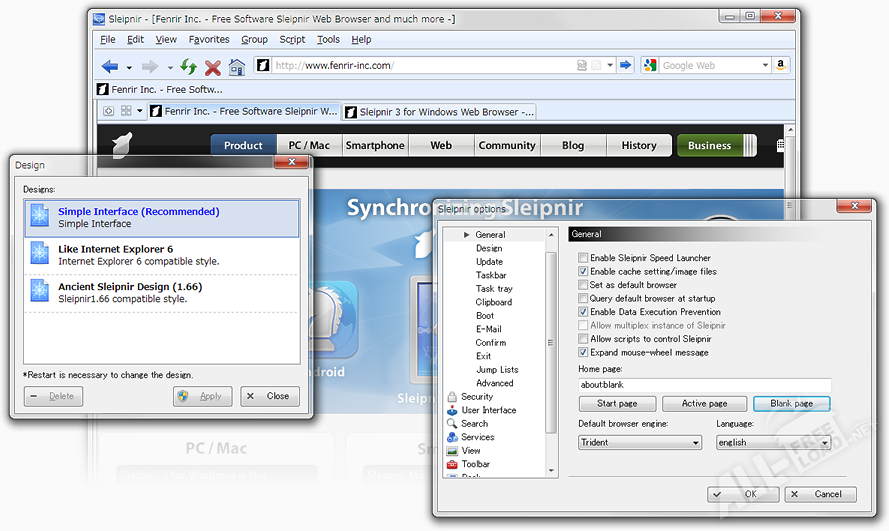Интернет-обозреватель Слейпнир изначально был разработан на основе движка Blink, однако с последующими обновлениями были добавлены еще несколько механизмов отображения веб-страниц: Trident и WebKit. Программа поддерживает полноценную работу с такими функциями, как отображение визуальных вкладок, управление при помощи жестов и аппаратное ускорение. Кроме этого, веб-браузер Sleipnir дает возможность использовать в процессе работы различные расширения от Google. Пользовательский интерфейс приложения отличается оригинальным графическим оформлением и удобным навигационным меню. В последней версии веб-браузера реализована инновационная технология FavTab, которая обеспечивает улучшенную работу со вкладками.