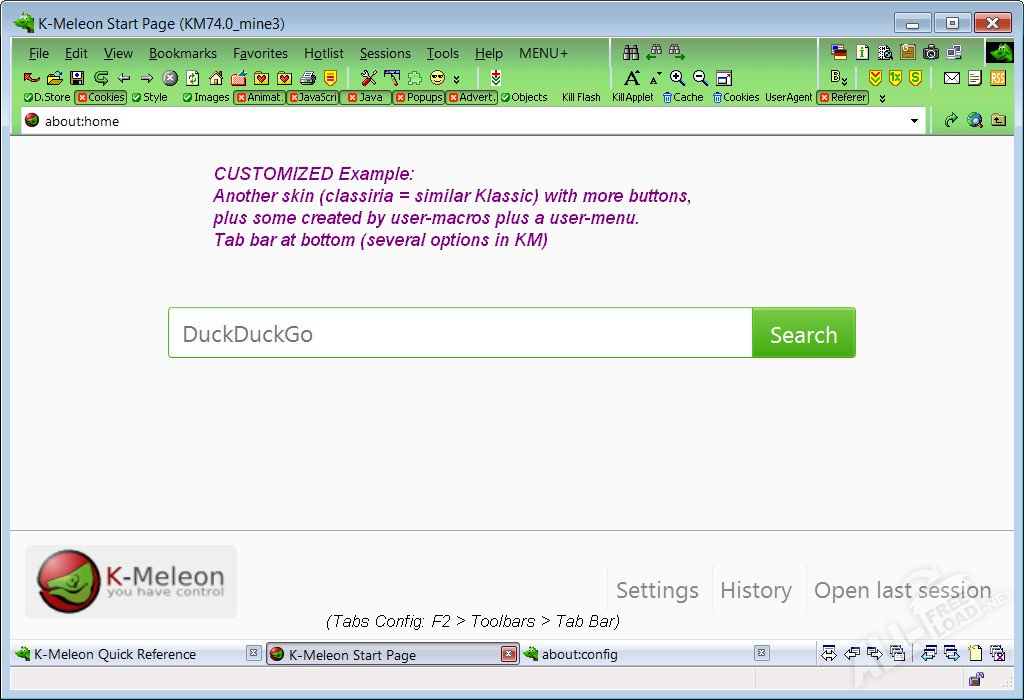 K-Meleon, по заверению разработчика, имеет очень «гибкий дизайн интерфейса». Меню настраивается с помощью файлов конфигурации в текстовом формате. Эта функция полезна в организациях, где браузер должен быть настроен для общего публичного использования, например в публичной библиотеке или в Интернет-кафе. Системные администраторы последних являются наиболее преданными пользователями программы, которые точно знают, зачем нужно скачать «К-Мелеон». Хотя отдельные панели инструментов можно перемещать вручную, пользователи в основном должны редактировать файлы конфигурации панели инструментов, чтобы вносить любые изменения в макеты кнопок, поскольку отсутствует графический интерфейс пользователя (GUI) для их настройки.