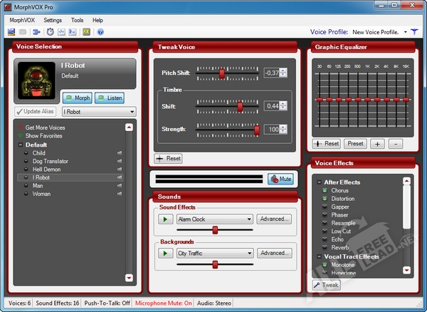 Изменению подвергается не только высота тона, но и тембр голоса, поэтому утилита MorphVOX может видоизменить ваш голос до неузнаваемости, сделав из мужского женский или наоборот. Идеально подходит для маскировки в онлайн играх, поможет разыграть друзей или просто весело провести время. В программе MorphVOX присутствует большое количество встроенных звуковых спецэффектов, например, таких как барабанная дробь