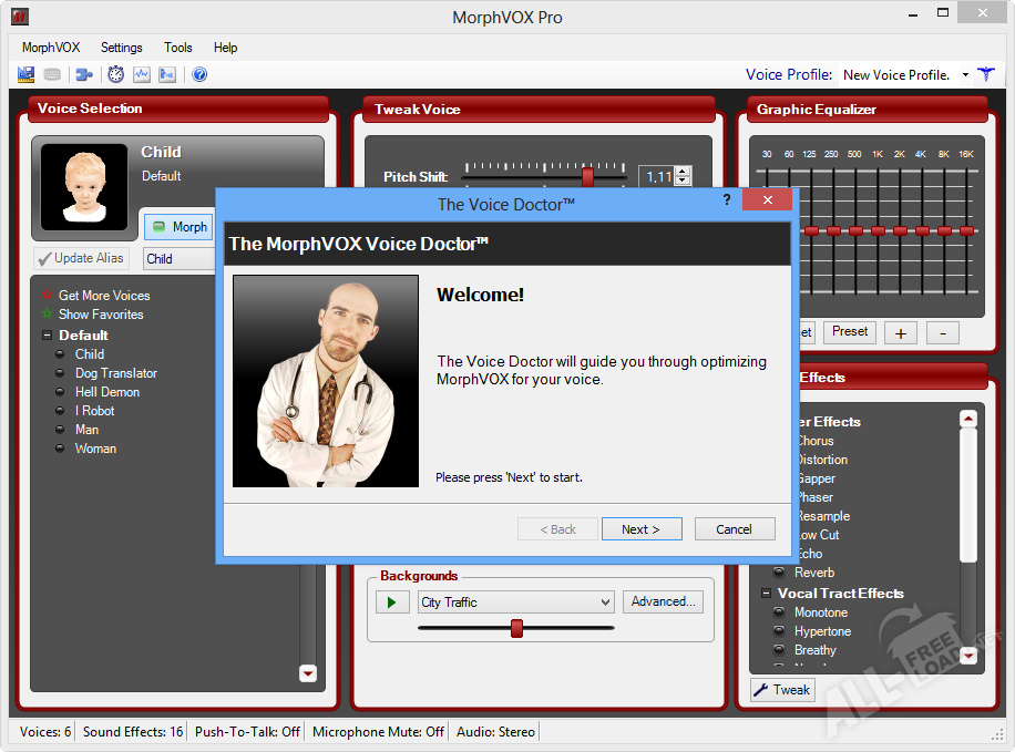 Для автоматической настройки MorphVOX под ваш голос и микрофон при первом запуске в программе есть встроенный помощник Voice Doctor. Он поможет отрегулировать громкость, автоматически настроит эффекты изменения голоса и, по результату полученных данных, подготовит программу к работе. Один раз настроив и сохранив высоту, тембр и силу тембра голоса в шаблон, можно занести его в список шаблонов, и затем оттуда его при необходимости можно будет выбрать. При включенном определенном шаблоне программа будет изменять голос автоматически.