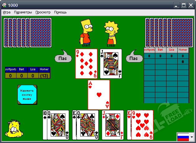 В игре принимают участие четыре человека. Если у вас нет партнеров, а очень нравится игра 1000, скачать бесплатно ее можно на компьютер и играть с виртуальными партнерами, которых вам предложит программа.