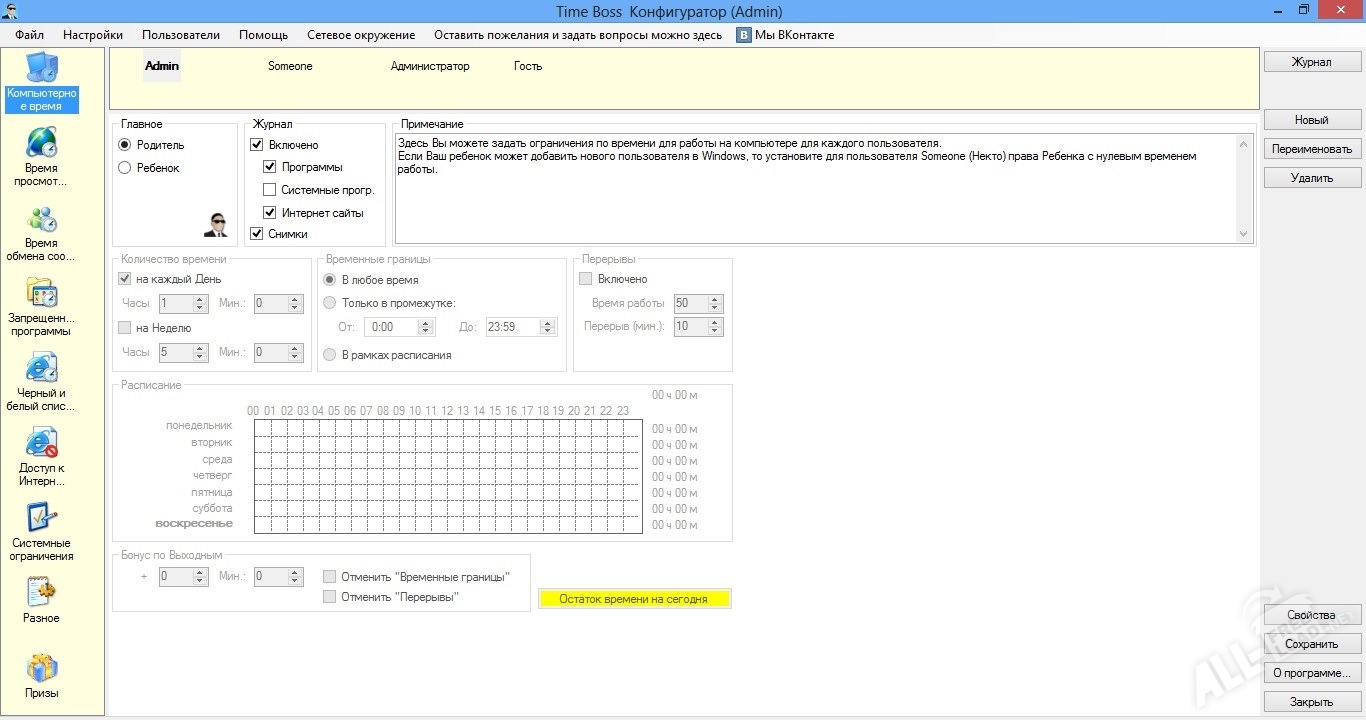 Помимо всего прочего, с помощью данной утилиты пользователь может лично создавать профили доступа и управлять ими, в том числе и удаленно. При пользовании компьютером сторонними лицами программа Time Boss автоматически будет блокировать доступ к приложениям и веб-сайтам, которые были отмечены в настройках. Также имеется возможность установки временных ограничений работы установленных на компьютере программ и операционной системы. Такие лимиты можно устанавливать согласно внутреннему расписанию на каждый день или несколько раз в течение недели. Кроме ведения журнала событий, приложение обладает инструментами для создания скриншот-логов. Программу Time Boss скачать бесплатно можно на нашем портале по ссылке, которая доступна после описания.
